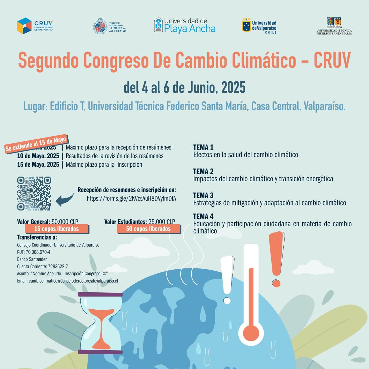 Hasta el 15 de mayo se extendió el plazo para enviar resúmenes al Segundo Congreso de Cambio Climático-CRUV, a desarrollarse entre el 4 y 6 de junio próximo, en la Universidad Técnica Federico Santa María (Edificio T, Avenida España 1580, Valparaíso).