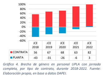 «Uno de los principales elementos a relevar obedecen a que se ha podido visibilizar que la brecha de género en el personal académico de la Universidad de Playa Ancha es producto de la relación de factores estructurales como lo es la división sexual del trabajo, diferencias en la trayectoria académica, así como de las propias condiciones institucionales de la universidad. En ese sentido, es interesante que al observar los datos de una manera general no se evidencian grandes diferencias, sin embargo, una vez que agregamos variables como el grado de jerarquización, calidad del contrato, años de antigüedad así como grado académico, es donde aparecen las brechas, siendo un ejemplo clave de ello, que el personal femenino con contrato de planta (para el año 2021) demoró entre 8 a 18 años más, que sus pares varones en alcanzar grados altos (del 1 al 3).