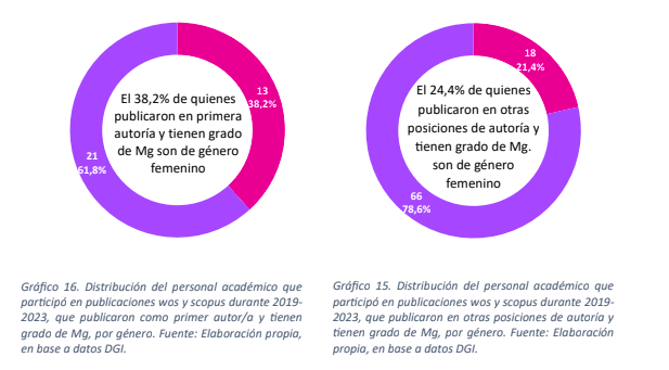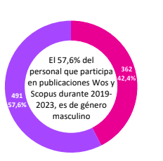 Si revisamos los datos de producción científica, se evidencia que los académicos inician su trayectoria académica antes que sus pares mujeres, pues del 14,6% de quienes participan en publicaciones Wos y Scopus durante el 2019 al 2023, el 73,9% son varones, situación que sucede tanto en quienes participan como primeros autores, como en otros lugares de la autoría.