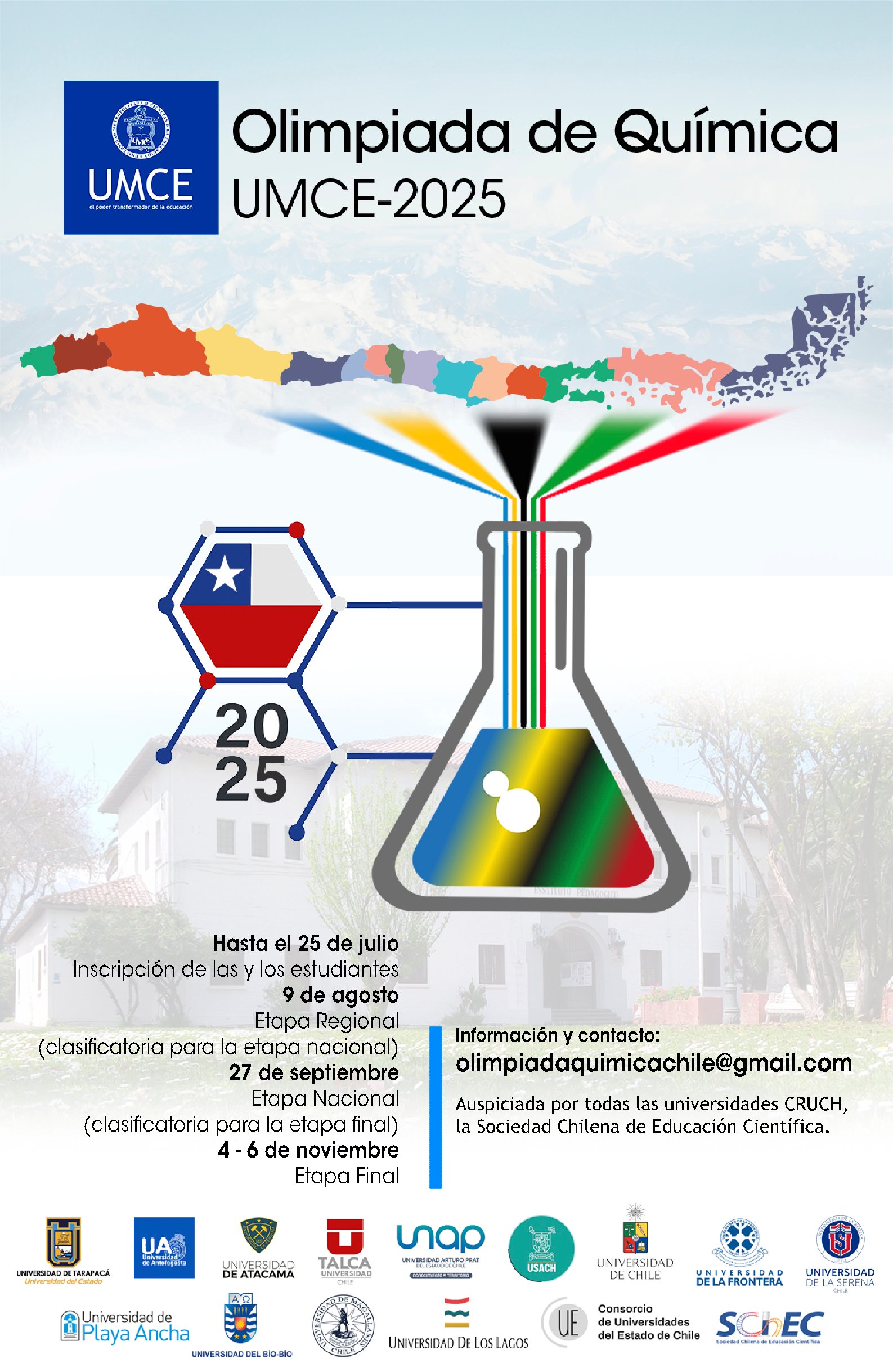 Una nueva versión de la Olimpiada de Química UMCE 2025 se desarrollará en el país y, la Universidad de Playa Ancha, a través de la Facultad de Ciencias Naturales y Exactas y de su Departamento de Ciencias y Geografía, realizará la etapa regional del evento el 9 de agosto (clasificatoria para la etapa nacional) y la etapa nacional, el 27 de septiembre (clasificatoria para la fase final).