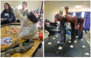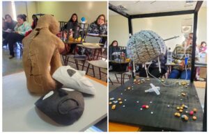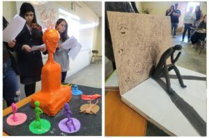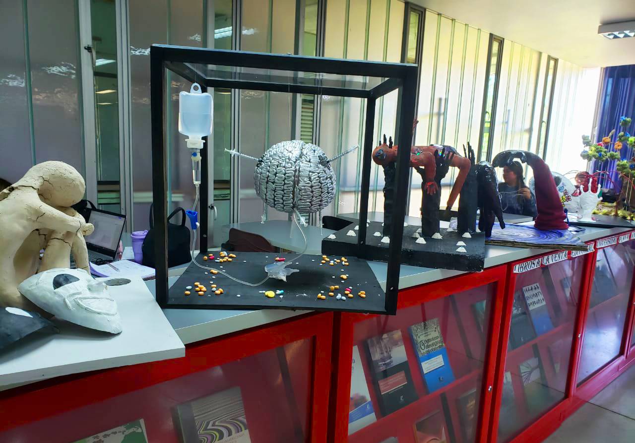 Respecto a la dinámica de elaboración de las esculturas durante la asignatura, la docente detalló que “los estudiantes realizaron una fase de bocetos a partir de una reflexión crítica grupal, tomaron en consideración temas locales e identitarios, y propusieron mediante el dibujo una primera etapa de construcción. Posteriormente, junto al apoyo de musicoterapia, construyeron sus obras durante el periodo de clases, viendo el estado de avance de los demás compañeros y fortaleciendo el pensamiento crítico y el diálogo constante entre ellos”.