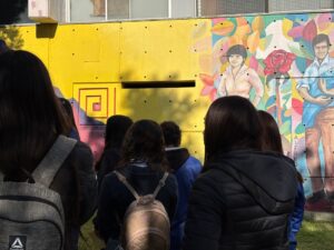 La ruta también consideró la visita al mural que se encuentra en el frontis de Casa Central, desarrollado por Mural Parlante, en el marco de la conmemoración de los 50 años del golpe cívico-militar, con imágenes icónicas de la historia de esta casa de estudios..