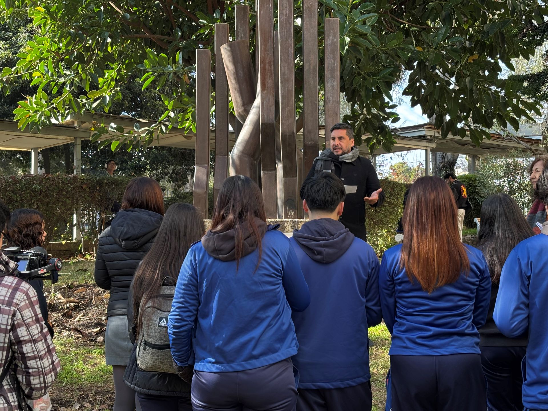 Las y los estudiantes se reunieron en el Patio de la Memoria, ubicado en Casa Central, donde realizaron un reconocimiento a miembros de la institución, que fueron víctimas de la dictadura cívico militar. Conocieron el Memorial de DD.HH., obra realizada por la exdecana de la Facultad de Arte, Lucy Lafuente, así como el mural central, que da cuenta de parte de la historia de Cristina Carreño y Alfredo García, dos jóvenes ejecutados en dictadura por la Operación Cóndor.