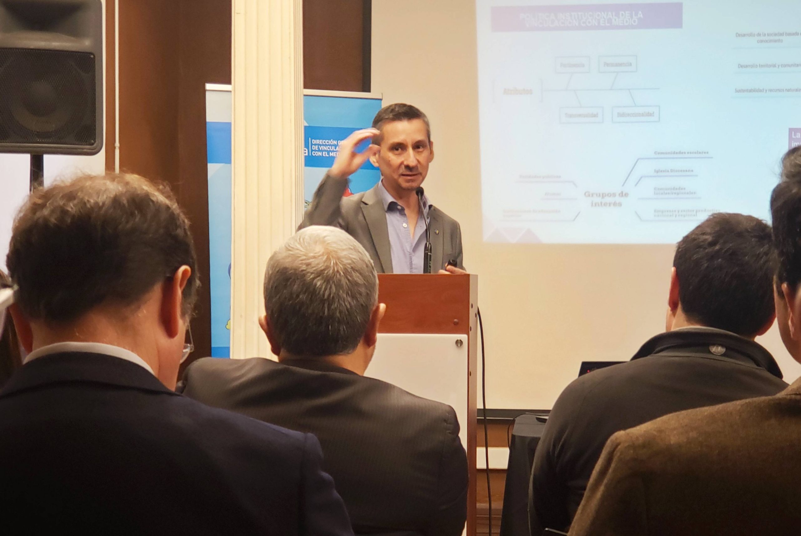El expositor Enrique Riquelme Mella, Vicerrector de Vinculación y Compromiso Público de la Universidad Católica de Temuco, enfatizó que la comisión “tiene una labor fundamental en el escenario actual de las universidades, y el objetivo de estas reuniones es trabajar en conjunto para un bien común. Tenemos la convicción de que la excelencia se logra trabajando colectivamente, por lo que hemos puesto todas las capacidades de las universidades en función de un objetivo común, logrando en este caso avanzar sobre algo fundamental, un glosario conjunto que orienta el trabajo de los modelos de gestión e, incluso, de algunas políticas que están formulando unidades de Vinculación con el Medio. Y también puede ser un buen insumo para que la CNA recoja elementos básicos de conceptualización desde quienes hacemos la vinculación con el medio en las instituciones de educación superior”.