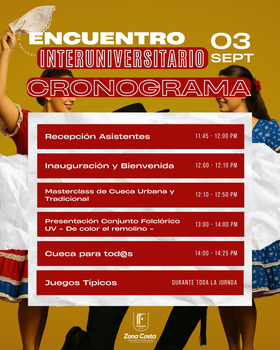 La Dirección de Deportes y Recreación de la Universidad de Playa Ancha (UPLA) y la Federación Nacional Universitaria de Deportes Zona Costa (FENAUDE Zona Costa) invitan a toda la comunidad UPLA a unirse a la «Fiesta Dieciochera: Encuentro interuniversitario por nuestras tradiciones«.