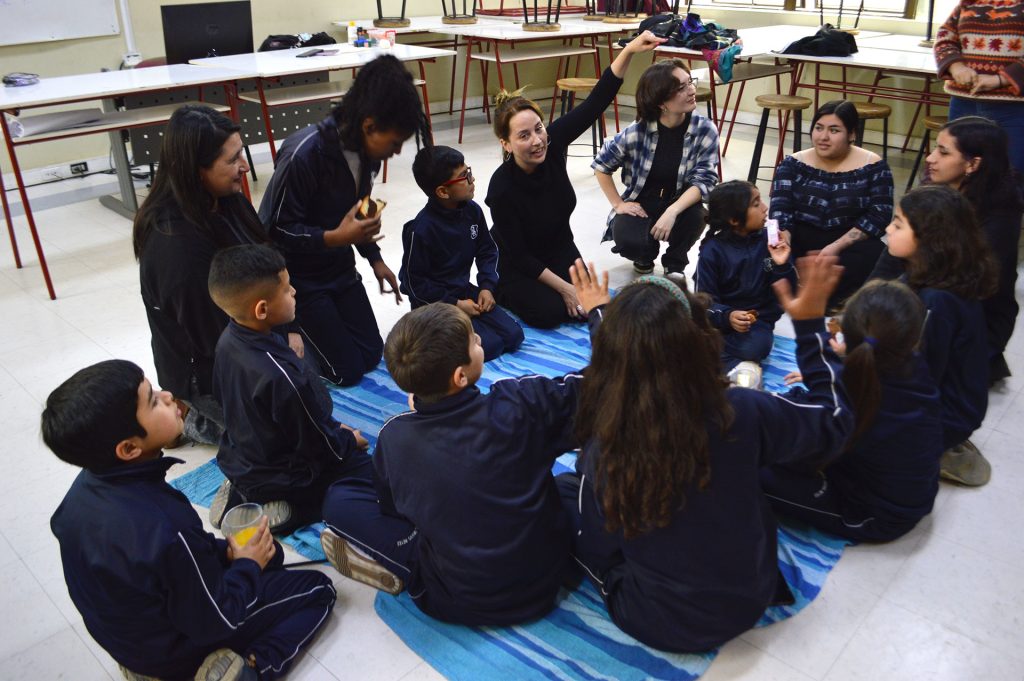 En ese marco, y para reforzar el proceso de acompañamiento pedagógico, la Dra. Marla Freire, junto a estudiantes de Pedagogía en Artes Visuales que asistieron en calidad de ayudantes, dispuso para esta tercera tutoría de academias juegos dinamizadores, pensar colaborativamente ideas para el proyecto e imaginar el trabajo con materiales de la naturaleza para dar el color y la gráfica deseada a las páginas de las libretas ecológicas.