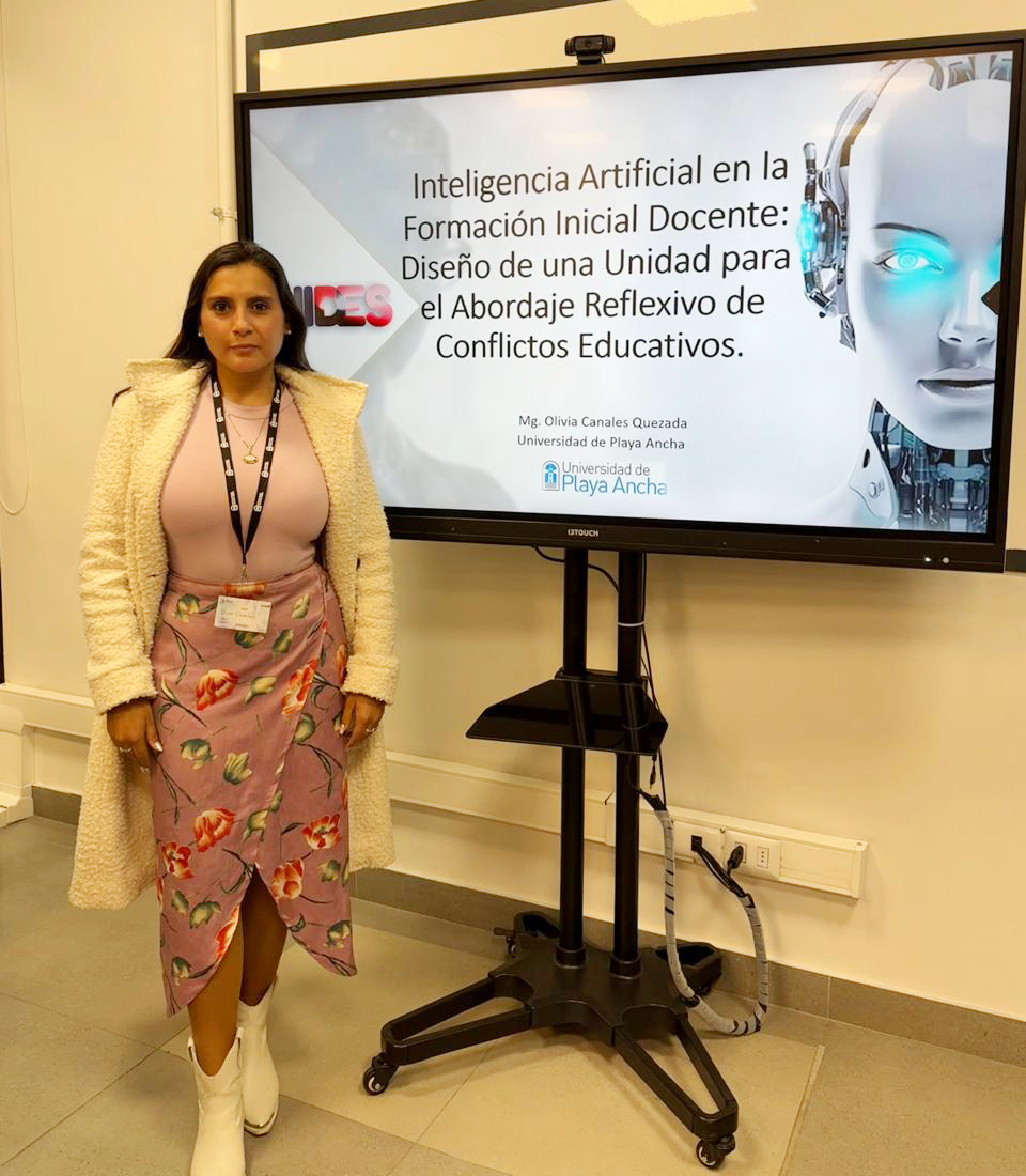 Bajo el lema “Transformando la enseñanza superior: IA y aprendizaje sin fronteras”, la académica presentó la ponencia titulada: “Inteligencia artificial en la formación inicial docente: diseño de una unidad para el abordaje reflexivo de conflictos educativos”.