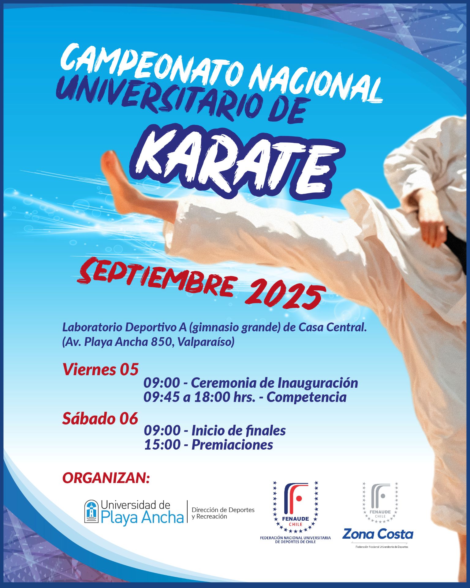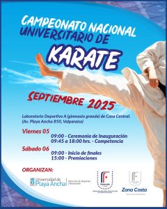 Este 5 y 6 de septiembre, la UPLA será la sede del Campeonato Nacional Universitario de Karate, evento organizado por la Federación Nacional Universitaria de Deportes, FENAUDE, y desarrollado en la región de Valparaíso por FENAUDE Zona Costa.