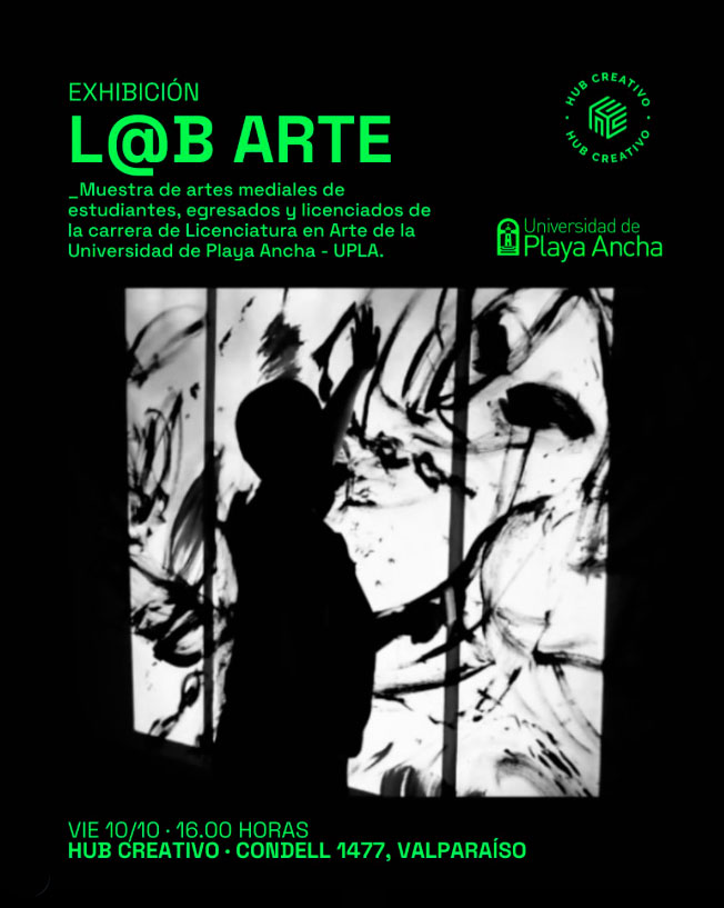 Entre las 16:00 y 20:00 horas del viernes 10 de octubre de 2025 el Hub Creativo de Valparaíso expondrá por única vez la exposición de obras de artes mediales de las y los integrantes del L@b Arte de la Universidad de Playa Ancha, conglomerado que reúne a estudiantes, egresadas (os) y licenciadas (os) de la carrera de Licenciatura en Arte de la Facultad de Arte de la UPLA.