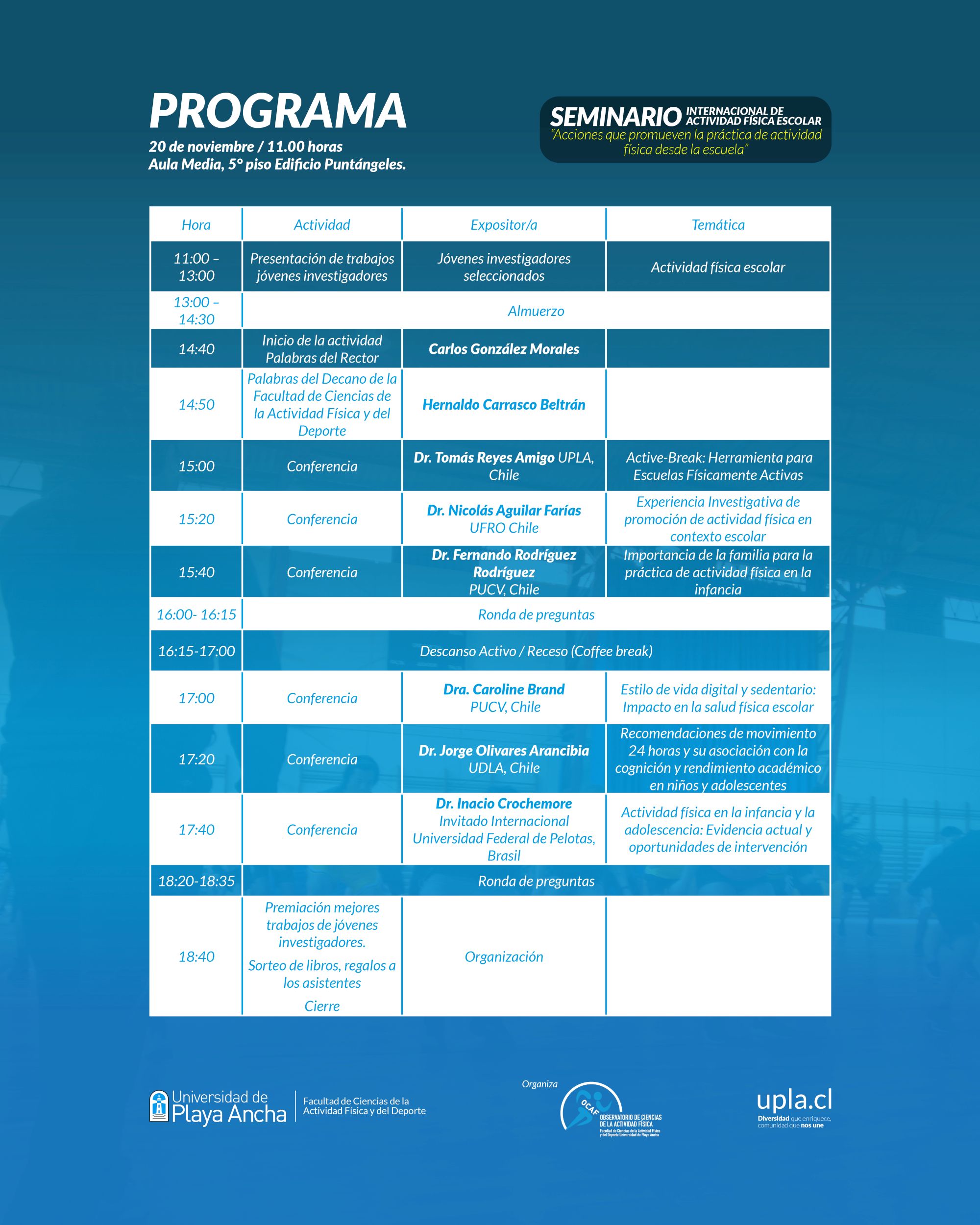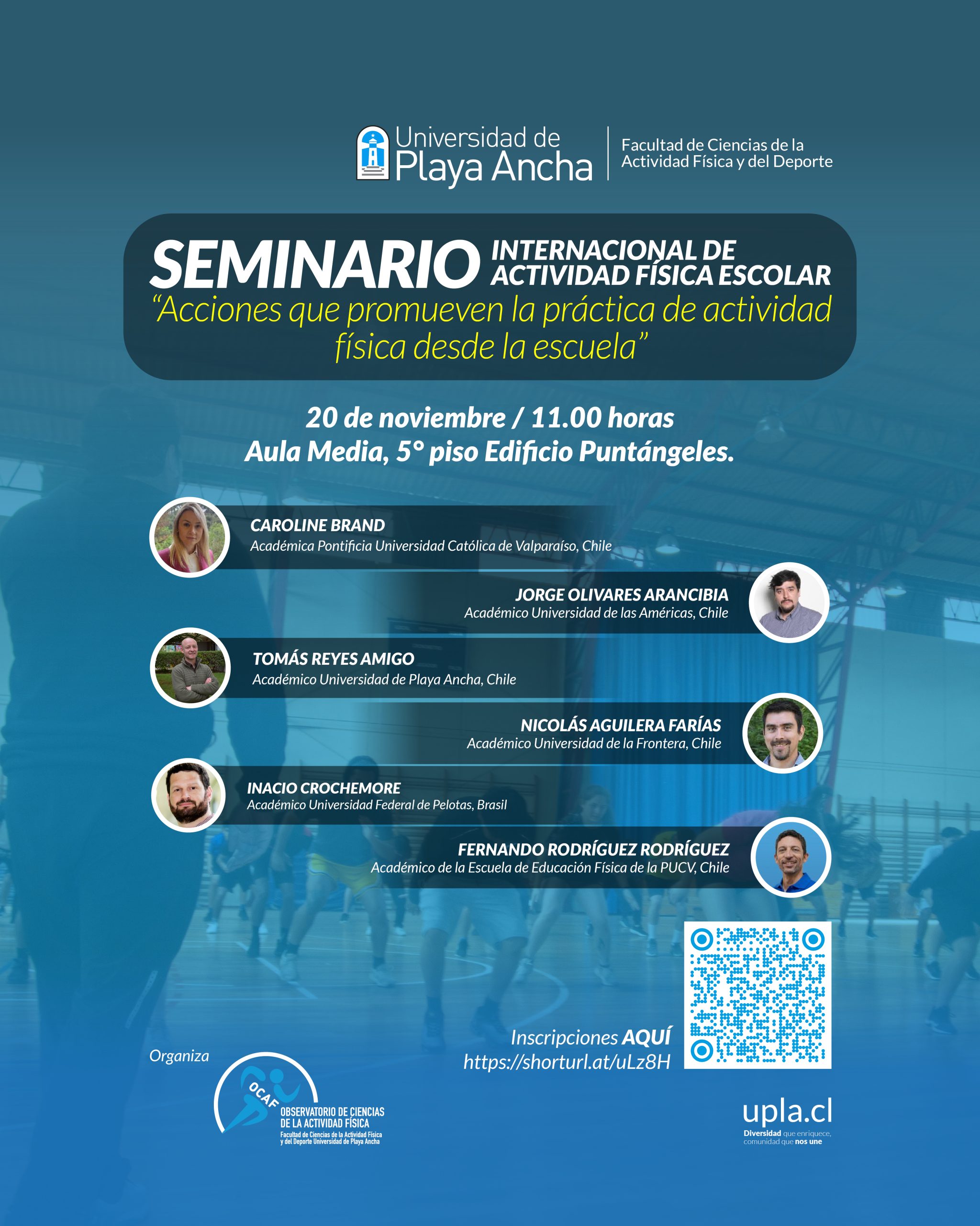 El seminario, a realizarse el 20 de noviembre, entre las 11 y las 18:30 horas, en el edificio Puntángeles, es organizado por el Observatorio de Ciencias de la Actividad Física, OCAF, dependiente de la Facultad de Ciencias de la Actividad Física y del Deporte, y responde a la imperante necesidad de fortalecer la integración de la actividad física en el entorno escolar. Este esfuerzo busca contrarrestar el comportamiento sedentario que predomina en la población infanto-juvenil, un objetivo que se vincula con la meta de desarrollar la línea de investigación del OCAF en actividad física escolar.