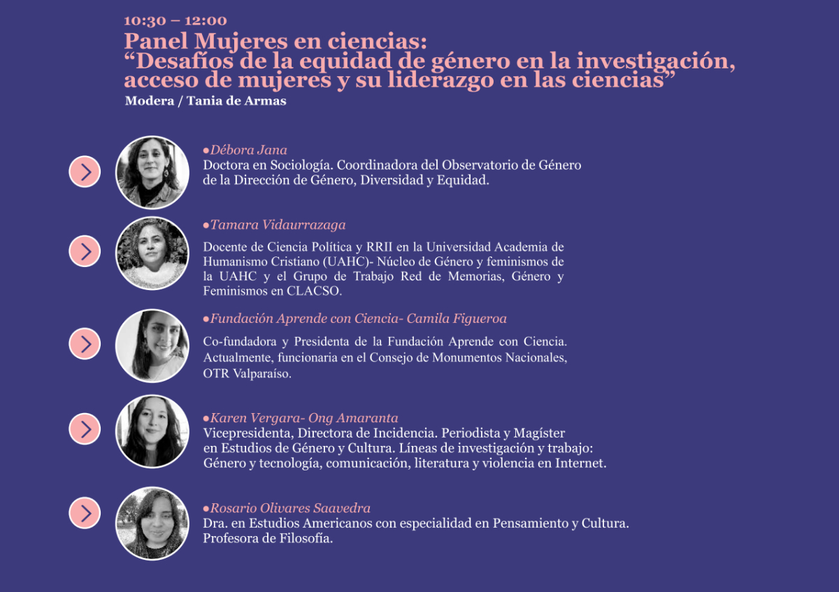 El primero de ellos, «Desafíos de la equidad de género en la investigación, acceso de mujeres y su liderazgo en las ciencias” contará con la participación de las académicas invitadas Débora Jana, Tamara Vidaurrázaga, Camila Figueroa, Karen Vergara y Rosario Olivares, y será moderado por la Dra. Tania de Armas Pedraza del proyecto InES Género.