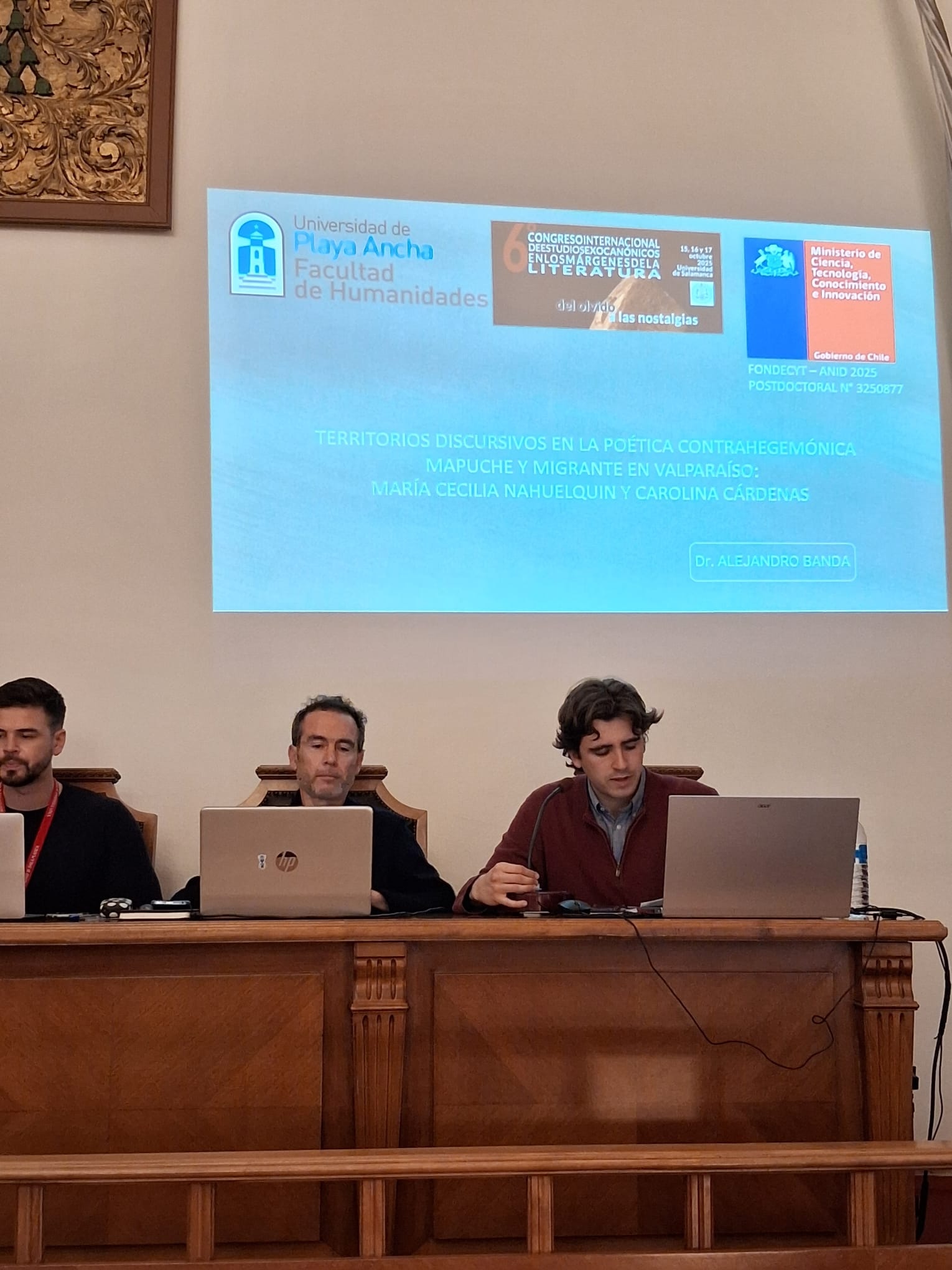 En la Facultad de Filología de la Universidad de Salamanca, Alejandro Banda participó del VI Congreso Internacional de Estudios Exocanónicos en los Márgenes de la Literatura “Del olvido a las nostalgias”, dentro de la mesa “Memorias del desborde”, con la ponencia titulada “Territorios discursivos en la poética contrahegemónica mapuche y migrante en Valparaíso”, donde expuso parte de sus hallazgos analizando los discursos líricos de la poeta mapuche y playanchina María Cecilia Nahuelquin y de la poeta colombiana Carolina Cárdenas, actualmente radicada en Valparaíso. Su presentación en el Aula Magna de aquella universidad fundada en el siglo XIII, subrayó el valor de la escritura de mujeres y de los procesos de resistencia cultural y literaria que deben ser atendidos desde una crítica con perspectiva de género y decolonial.