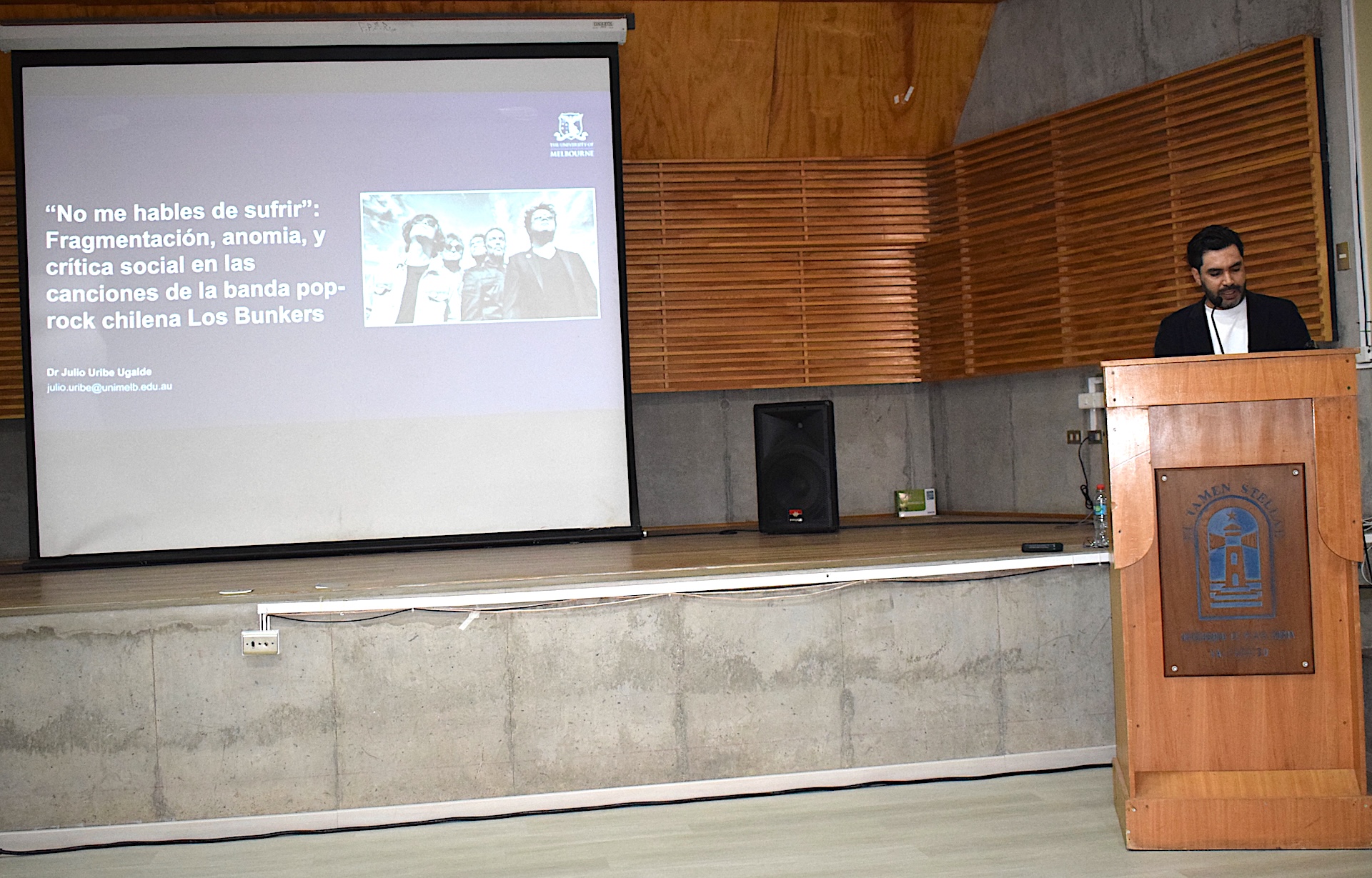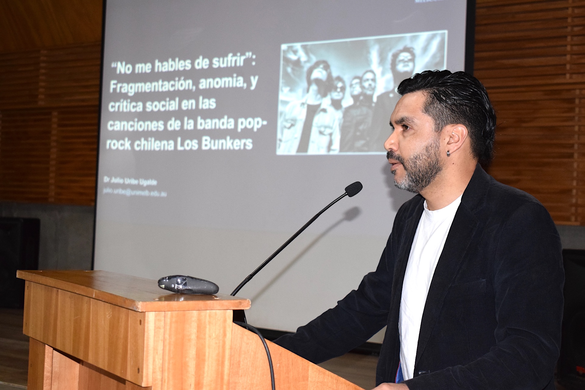 El Dr. Uribe, cuya formación inicial fue la literatura inglesa y norteamericana y que cuenta con una tesis doctoral sobre las referencias musicales en la obra de Pedro Lemebel, explicó que su investigación actual invierte la ecuación: ahora estudia la música, pero desde la óptica rigurosa de las letras. Su ponencia, titulada elocuentemente “No me hables de sufrir: Fragmentación, anomia y crítica social en las canciones de la banda pop-rock chilena Los Bunkers”, partió de una pregunta fundamental que ha desafiado a la academia: ¿Las canciones pueden considerarse textos literarios?
