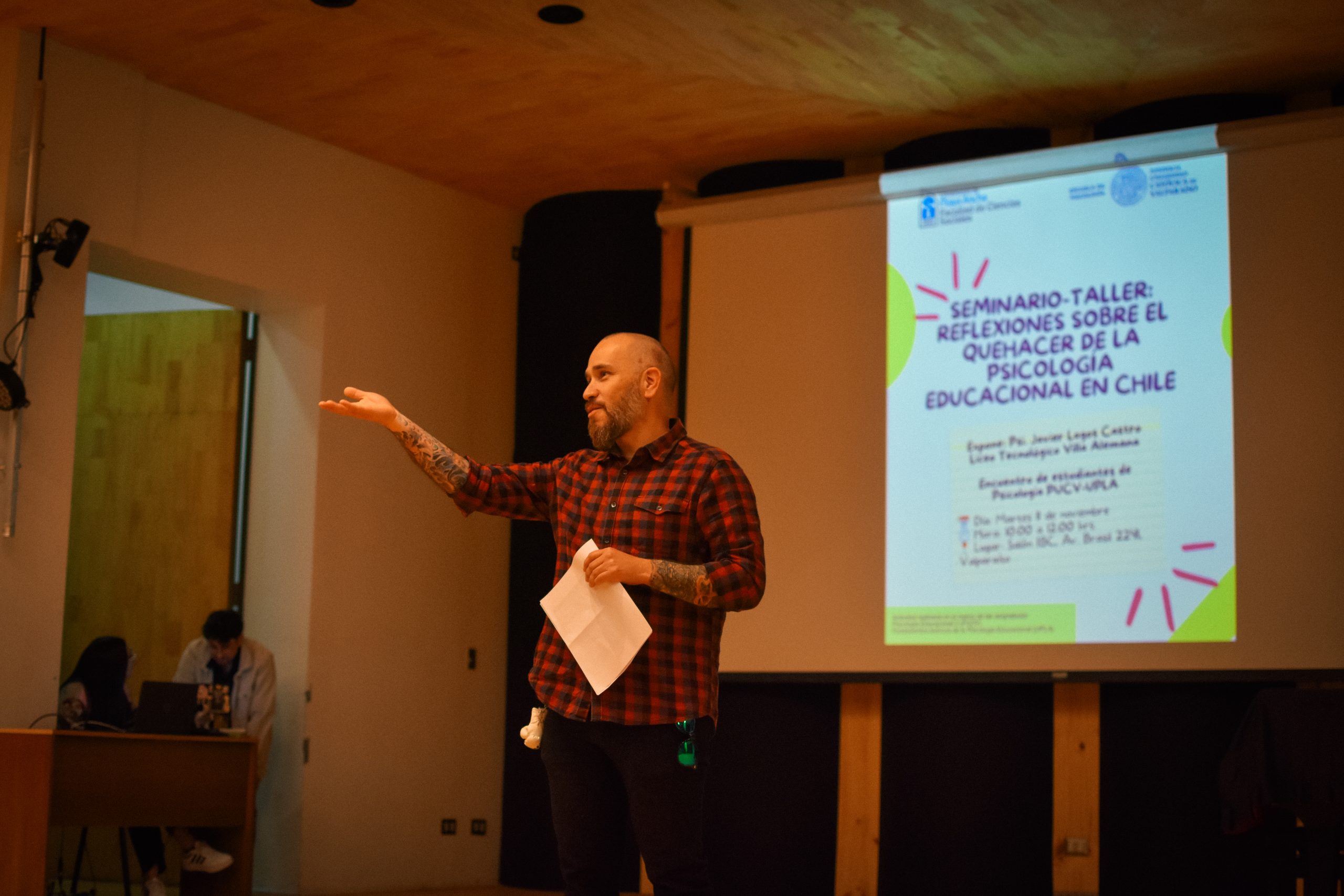Una positiva evaluación tuvo el Seminario-Taller: Reflexiones sobre el quehacer de la Psicología Educacional en Chile, realizado en el marco del “Encuentro de Estudiantes de Psicología de la Universidad de Playa Ancha y la Pontificia Universidad Católica de Valparaíso”, desarrollado en el Aula Mayor IBC de la Facultad de Ingeniería de la PUCV. A la iniciativa asistieron estudiantes de las asignaturas Fundamentos Teóricos de la Psicología Educacional (UPLA) y Psicología Educacional II (PUCV), y contó con la charla de Javier Lagos Castro, psicólogo del Equipo Psicosocial del Liceo Tecnológico Villa Alemana.