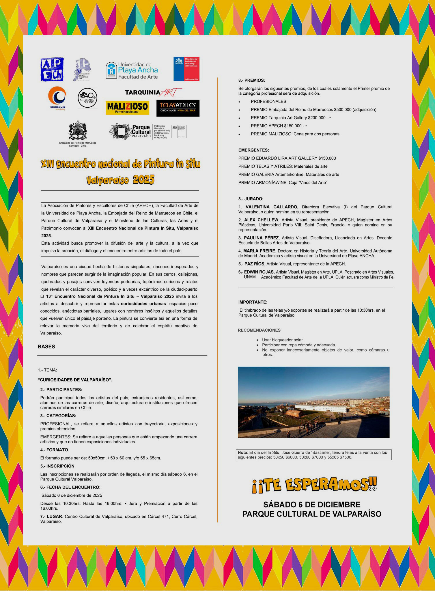 Con la realización del “XIII Encuentro Nacional de Pintura In Situ”, Valparaíso 2025, se reafirma el compromiso de los organizadores (APECH, UPLA e instituciones asociadas con el desarrollo del arte en Chile), de hacer masiva la invitación a las y los artistas a vivir una experiencia creativa que celebra la riqueza visual, histórica y humana de Valparaíso.