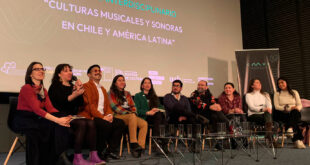 Eileen Karmy, académica del Departamento de Artes Integradas, y Rodrigo Montes, profesor de la carrera de Pedagogía en Educación Musical de la Facultad de Arte, fueron parte del panel “Políticas culturales desde abajo. Experiencias desde la música”.