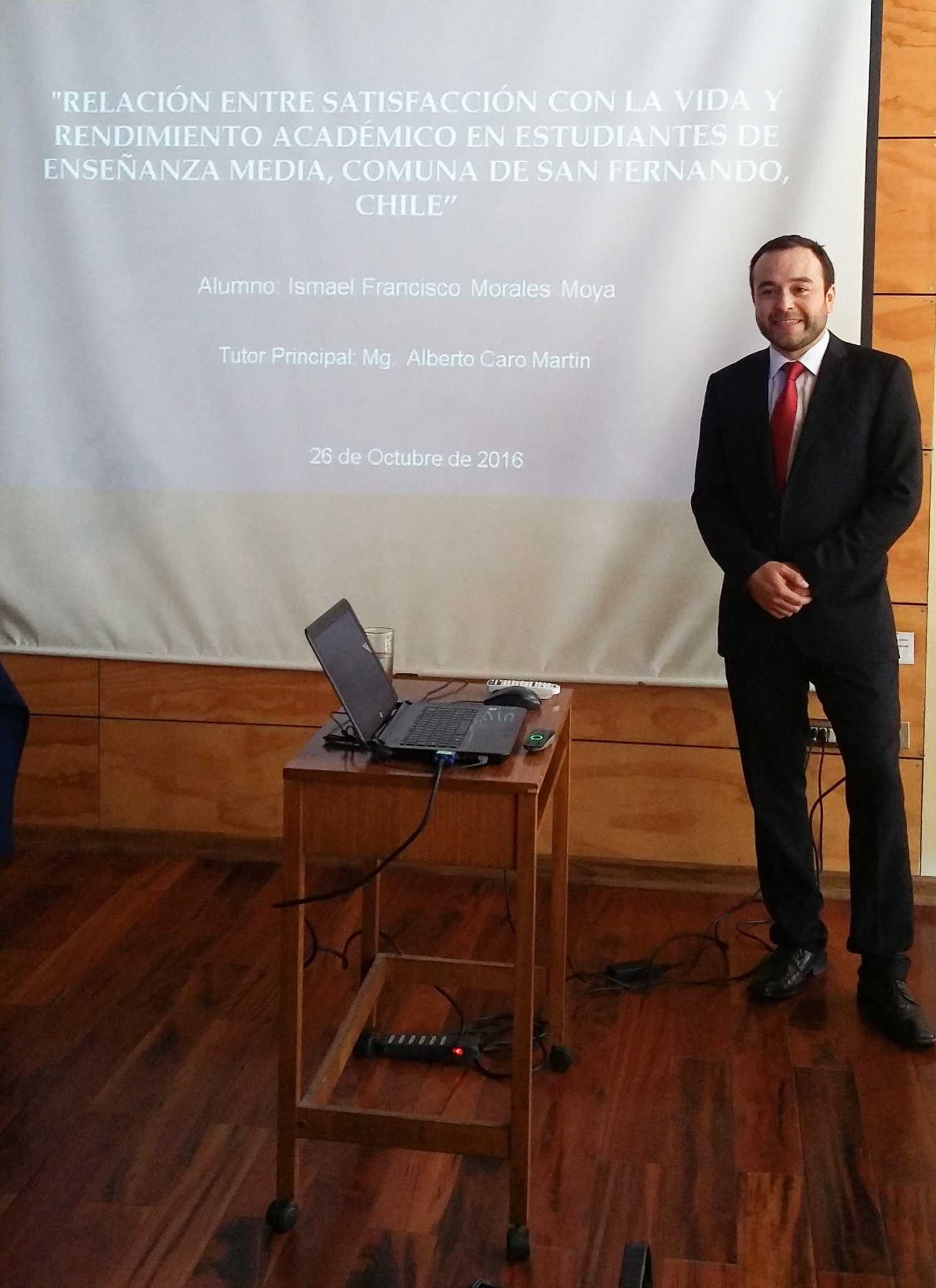 El estudiante del Magíster en Evaluación Educacional de la Universidad de playa Ancha, Ismael Francisco Morales Moya rindió su examen de grado el pasado 26 de octubre, ocasión en la que presentó su investigación titulada «Relación entre satisfacción con la vida y rendimiento académico en estudiantes de enseñanza media, comuna de San Fernando, Chile».